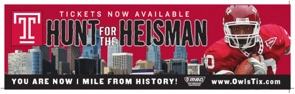 Scott Walcoff, from the school’s promotion department, is handling the back end of this campaign (for potential ticket-buyers) rather brilliantly with a Hunt of the Heisman billboard strategically placed at locations within a mile of Lincoln Financial Field.