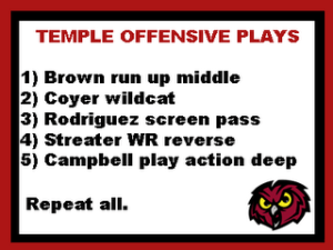 The second page of Matt Rhule’s playbook is illustrated in the graphic here. All you need to know is that the graphic was made by the most precocious 17-year-old Owl fan ever. And there was not one long-time Owl fan sitting in the stands who disagreed with him. The only person I came across who supported Rhule was the father of a Rhule recruit and I run into a lot of Owl fans. Even more importantly, I know what I see and smell and it didn’t pass the vision and smell test with Rhule.
