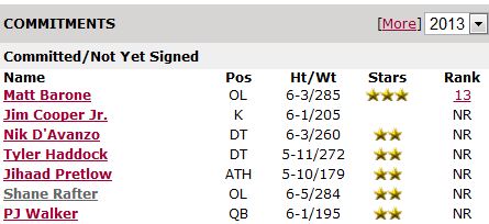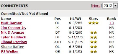 Too early to tell if it's promising or not promising. Definitely promising that Barone de-committed from UConn to go to Temple. Definitely promising that Cooper was ranked the No. 1 placekicker in the country at a five-star Texas camp. Promising that Jihaad and P.J. left Rutgers' offers on the table. Not promising that we don't have one commit that Penn State wanted, despite the fact that Penn State is sure to receive "institutional control" sanctions that could result in loss of scholarships, bowls or maybe both.Promising that we are only seven schollies into 25 and the best de-commits might be yet to come from conferences like the Big 10.