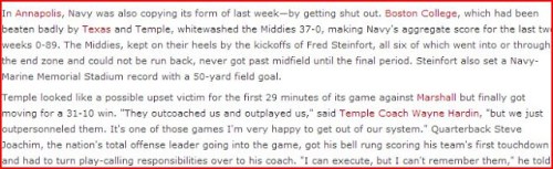Completely agree with the tone and premise of this post. At this point of Temple's evolvement into a difference-making BCS program, I would gladly take a well-prepared team with a thoughtful game plan. Mike, I think that is why even the UConn victory felt a little hollow. While the closing drives were excellent, it never should have come to that. Coach Slogan was done in all game long by Pasqualoni.On the fumbled punt in the opening drive of the Pitt game, I put that one on Matt Brown. He easily could have come up and played that ball, but gave up on it too soon and became a traffic cop. His teammate was not out of position, with back to the ball just 30 yards downfield. That is another example of bad coaching. Lou Holtz would have lost a kidney yelling at Brown after that one. He had a particular pet peeve about punt returners giving up on the ball and losing field position (or possession).Let's hope for best against Louisville. It's actually a good set up to be more competitive than we think. Classic look-ahead game for Cardinals.