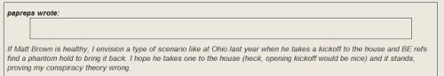 I know it is extremely unlikely but I would love to get the #4 Big East Bowl which is basically in my back yard(Harlem) at Yankee stadium. And I have wanted a reason to go see the new Yankee stadium but I Hate the Yankees so much. However, If we even do get to a bowl game we are probably looking at the #5 spot(I dont see the big east getting 6 teams in) against an Ole Miss/Vanderbilt in Alabama or a potential future big east match up with UCF or Tulsa in Tennesse. I really hope that we can somehow make it to a bowl game if for no other reason than giving this "young" team a few more weeks of valuable practice. I think Kevin Newsome could get ready to start at safety after a few weeks of practice, we sure could use him. However, If we want a chance we need at least one of our QBs to throw for more than 25 yards in a game. That is the most pathetic stat line i have ever seen. 2-8 for 20 yards, with our backup 2-whatever for 23 yards. WE played 3 QBs and didn't break 60 yards passing. Absolutely, without a doubt cant play worse than that from a passing stand point. If I an opposing team I would move my safeties to corner and replace my safeties with additional linebackers. Even if a WR did get open it would either be overthrown or dropped. That way we could hold Temple to 20 yards for the whole game.