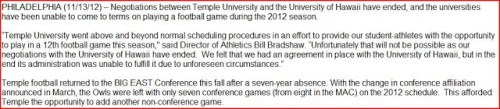 Just can't help but feel disappointed that the Hawaii game fell through. Like you said, it was a good way to gain practice. You never know, maybe we beat Syracuse and finish 5-6. It will be even more disappointing then. What happened to the team that beat South Florida? Even though USF is bad, that game and gameplan was the best one all season. Oh well.