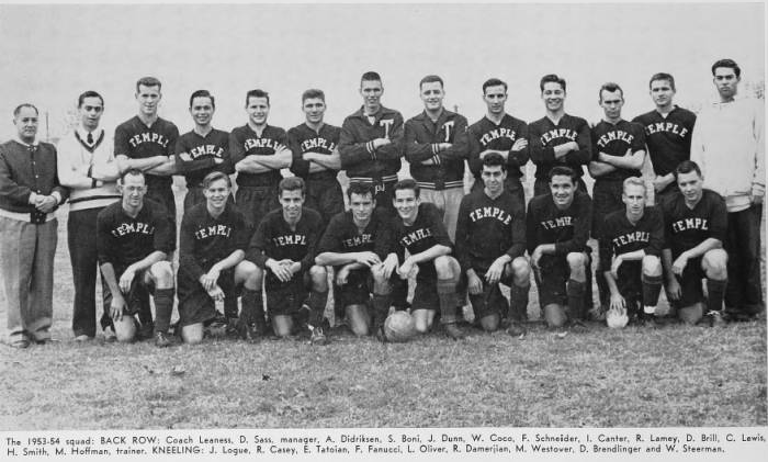 This is the 1953 Temple men’s soccer team which finished unbeaten and untied and No. 1 in the nation. The untied part is pretty amazing when you consider that 0-0 is the most common score in that sport and there was no overtime back then.