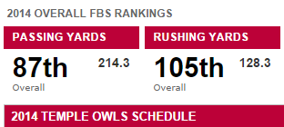 • amen … a lot of us have seen a guy do an exceptional job as Temple head coach. An “ok job” is just not good enough. I want an exceptional job. we have the personnel for two-back sets, yet we’re forcing the running game into a numbers’ mismatch/standoff at the point of attack. putting a blocking fullback in there to both open up the run AND the passing game turns the numbers to our advantage. there’s a reason why we’re ranked No. 97 in the nation in total offense and it’s not the kids.