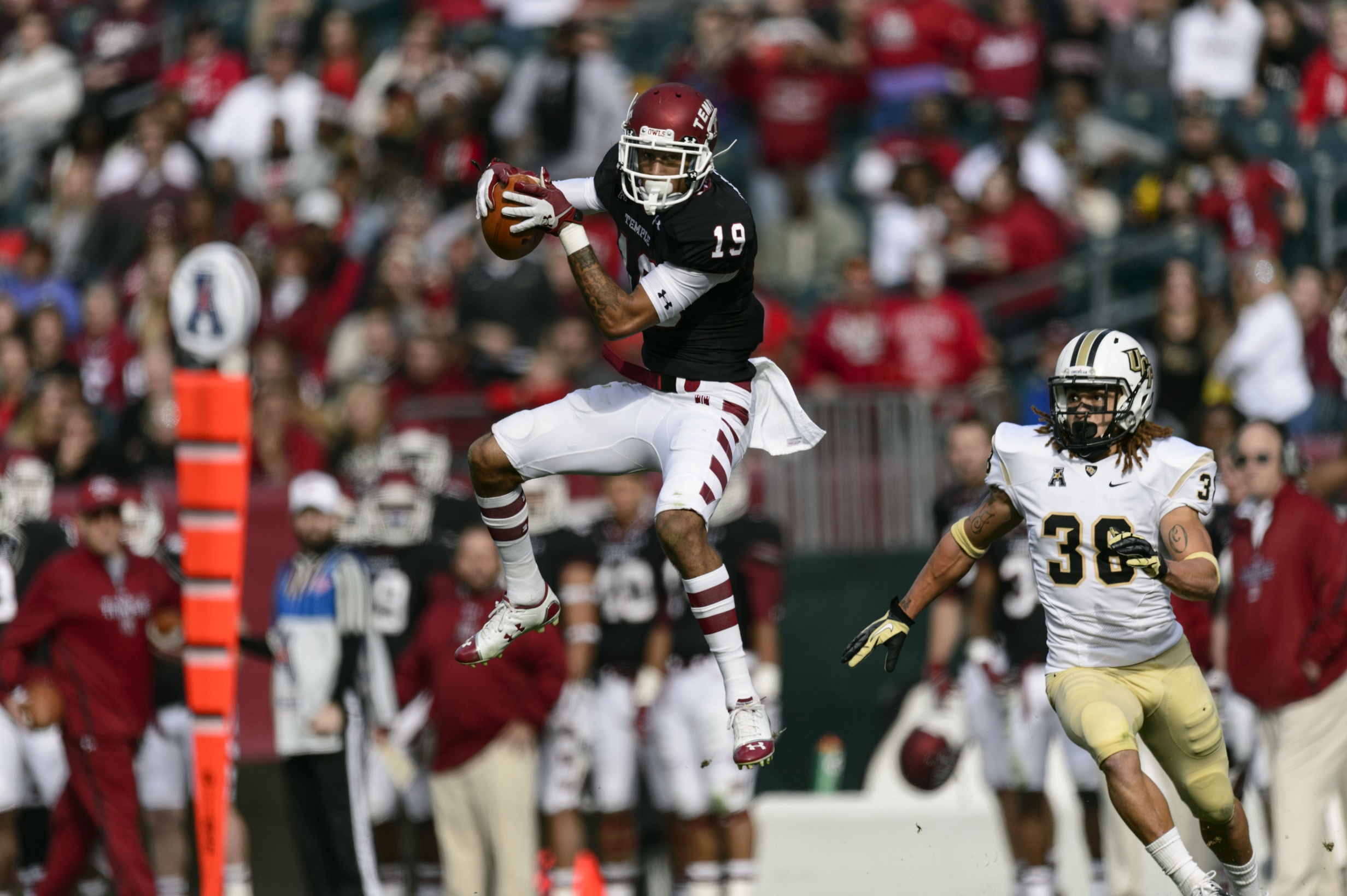 • Would have been worried about that except for his story this season paralleled his story the 2013 season. Missed all summer camp and the first couple of games to fix family issues in Florida, then came back, slapped on the pads and became a star wide receiver after not playing the WR position for two years (he was a d-back for the Owls in that year’s spring game). He will be fine. This fine: 88 receptions, 18 touchdowns, 1,448 yards. Temple will lead PSU at halftime, 21-6, with RA catching all three TD passes. I woke up after that.
