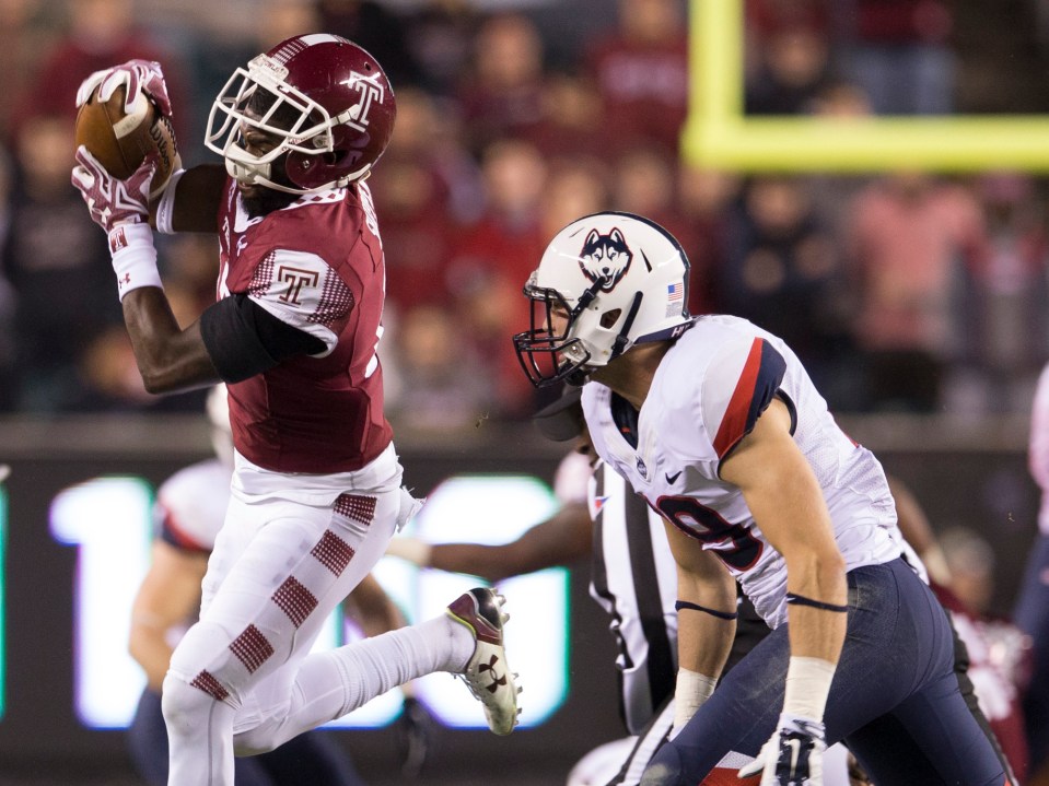PHILADELPHIA, PA – NOVEMBER 28: Brandon Shippen #17 of the Temple Owls catches a pass against Ellis Marder #19 of the Connecticut Huskies on November 28, 2015 at Lincoln Financial Field in Philadelphia, Pennsylvania. (Photo by Mitchell Leff/Getty Images)