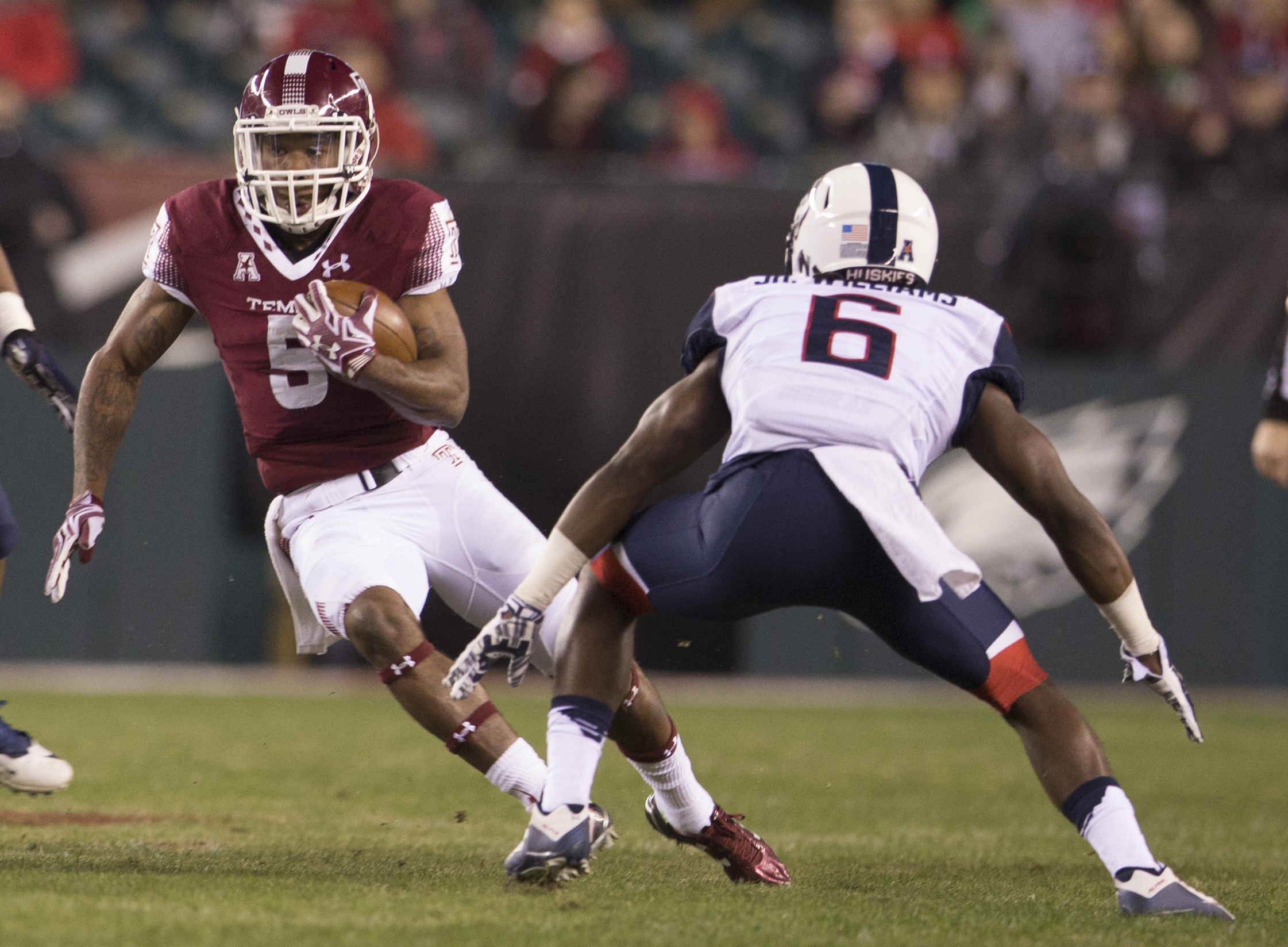 PHILADELPHIA, PA – NOVEMBER 28: Jahad Thomas #5 of the Temple Owls runs past Jhavon Williams #6 of the Connecticut Huskies on November 28, 2015 at Lincoln Financial Field in Philadelphia, Pennsylvania. (Photo by Mitchell Leff/Getty Images)