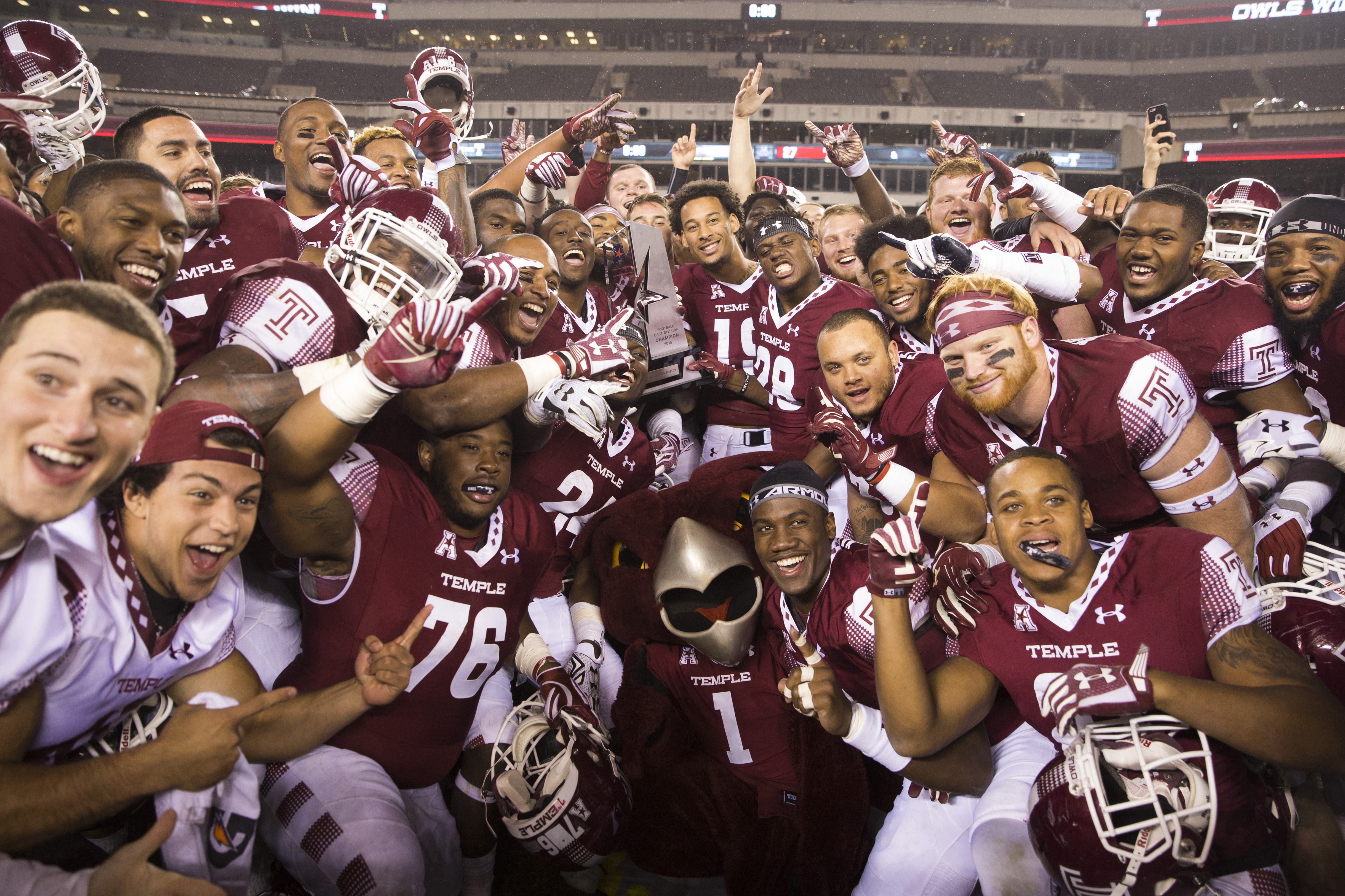 PHILADELPHIA, PA – NOVEMBER 28: The Temple Owls celebrate with the American Conference East Division Trophy after the game against the Connecticut Huskies on November 28, 2015 at Lincoln Financial Field in Philadelphia, Pennsylvania. The Owls defeated the Huskies 27-3. (Photo by Mitchell Leff/Getty Images)