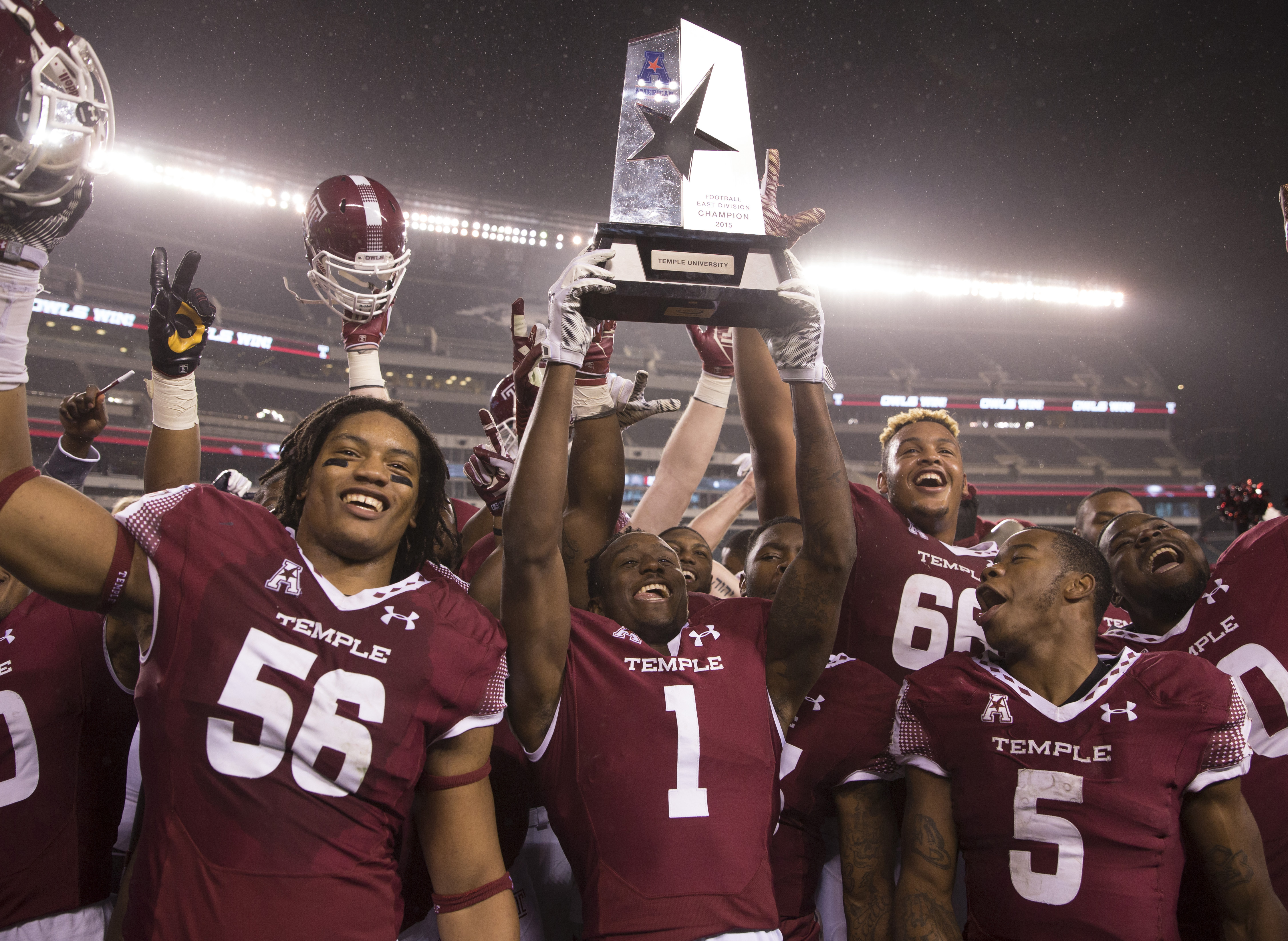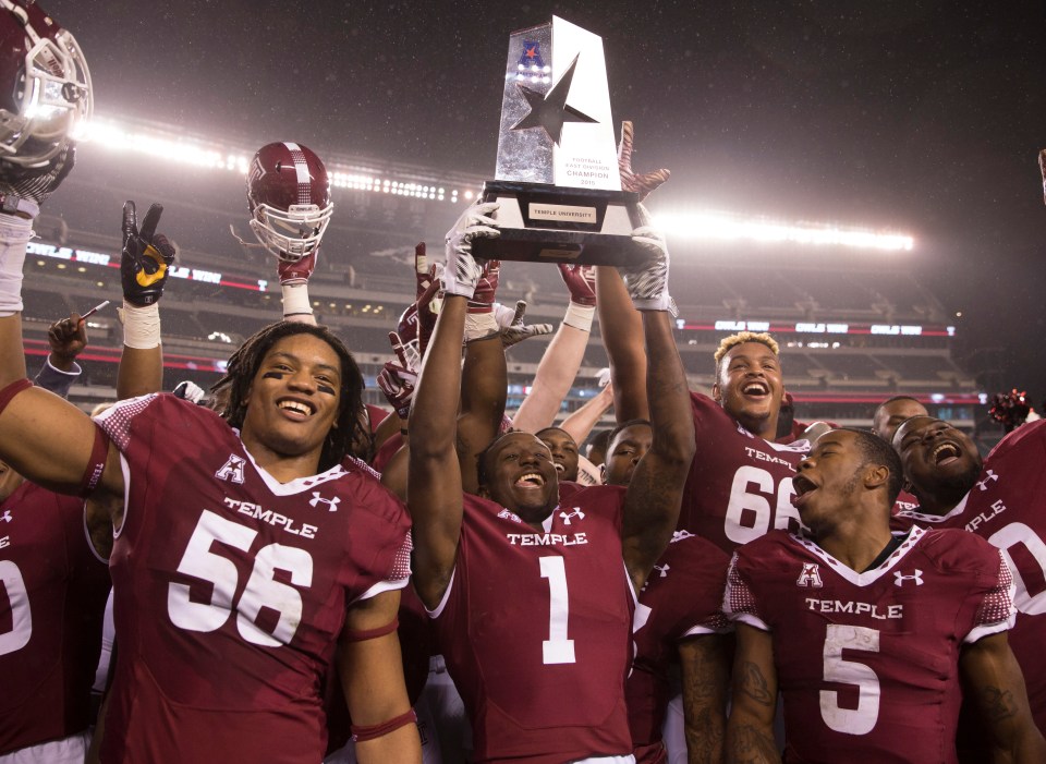 PHILADELPHIA, PA – NOVEMBER 28: Sharif Finch #56, Tavon Young #1, Jahad Thomas #5, and Dion Dawkins #66 of the Temple Owls celebrate with the American Conference East Division trophy after defeating the Connecticut Huskies on November 28, 2015 at Lincoln Financial Field in Philadelphia, Pennsylvania. The Owls defeated the Huskies 27-3. (Photo by Mitchell Leff/Getty Images)