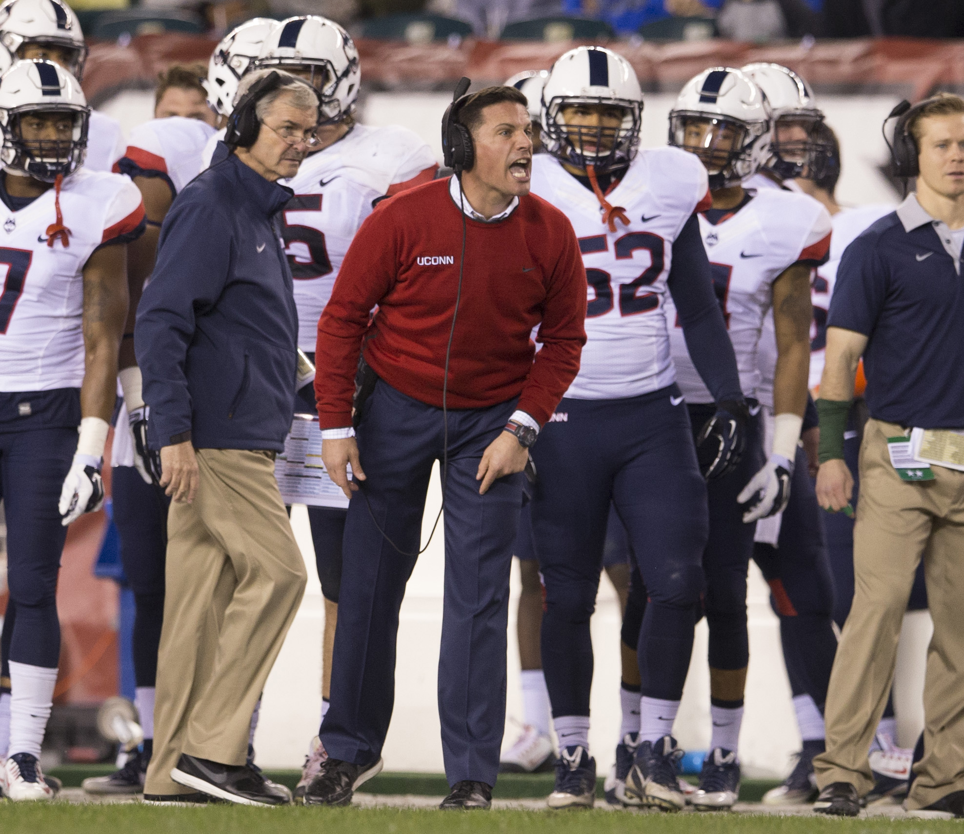 PHILADELPHIA, PA – NOVEMBER 28: Head coach Bob Diaco of the Connecticut Huskies reacts during the game against the Temple Owls on November 28, 2015 at Lincoln Financial Field in Philadelphia, Pennsylvania. The Owls defeated the Huskies 27-3. (Photo by Mitchell Leff/Getty Images)