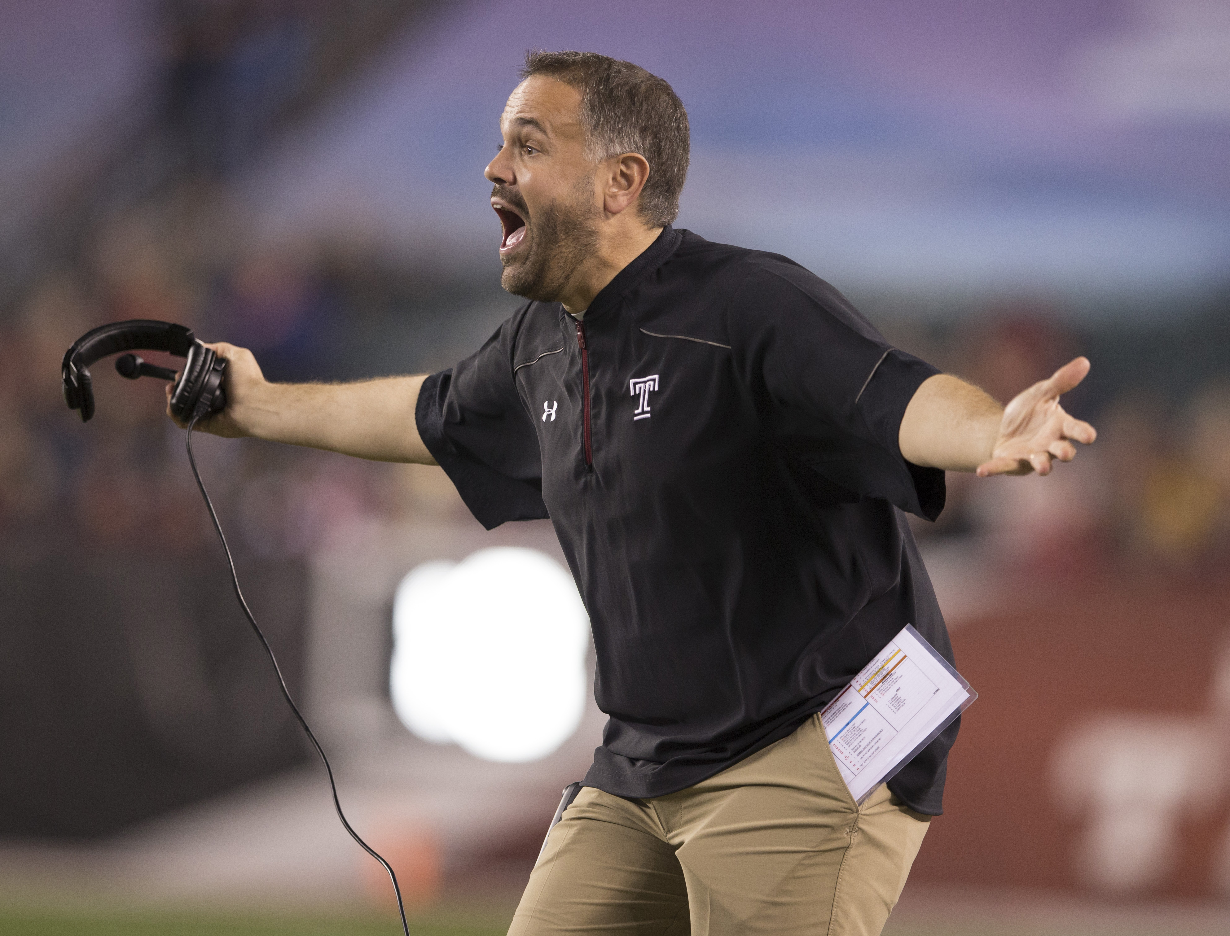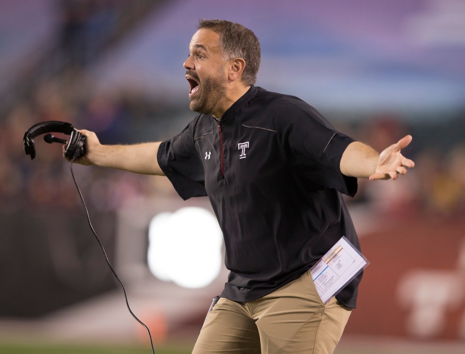 PHILADELPHIA, PA – NOVEMBER 28: Head coach Matt Rhule of the Temple Owls reacts in the game against the Connecticut Huskies on November 28, 2015 at Lincoln Financial Field in Philadelphia, Pennsylvania. (Photo by Mitchell Leff/Getty Images) *** Local Caption *** Matt Rhule