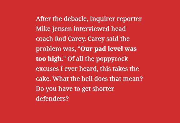 After the debacle, Inquirer reporter Mike Jensen interviewed head coach Rod Carey. Carey said the problem was, “Our pad level was too high.” Of all the poppycock excuses I ever heard, this takes the cake. What the hell does that mean? Do you have to get shorter defenders? Carey made no mention of coaching deficiencies.
