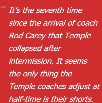 I said this has been a great streak, but we also had a number of pretty bad seasons in there too so OVERALL it’s been good considering Temple’s past history but really just a bit above mediocre. You can’t be breaking in newbe HCs and have them leave soon after some success and expect much. And don’t blame Dunphy – he didn’t hire Carey and has been INTERIM athletic director for only a year. I mean do you really expect him to, all on his own, fire Carey and suck up his salary? Will say tho, if the school keeps him and he doesn’t at least TRY to change things, than I’ll agree with you. But the AD can only do so much in terms of who controls the purse strings. It appears Temple athletics is flailing around right now.