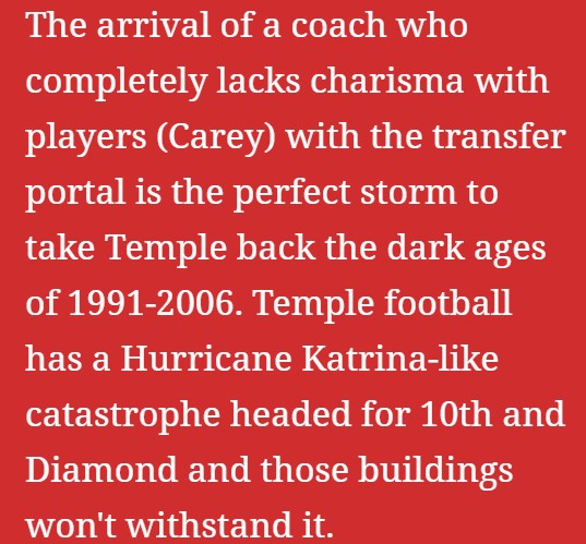 His reasoning to play at Vandy is legit. He should slot in as an immediate starter. He will be on television every week instead of ESPN+. It will raise his profile with NFL scouts. No reason for them to scout NFL talent at Temple any longer since all the pro prospects will end up in the transfer portal.