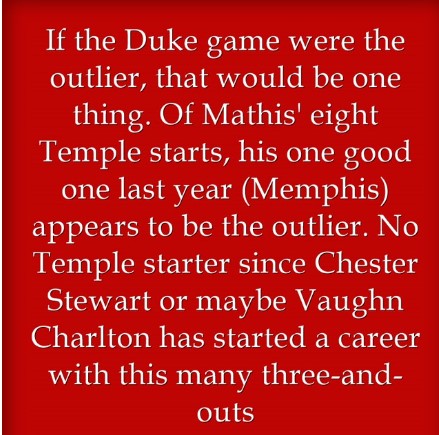 If the Duke game were the outlier, that would be one thing. Of Mathis’ eight Temple starts, his one good one last year (Memphis) appears to be the outlier. No Temple starter since Chester Stewart or maybe Vaughn Charlton has started a career with this many three-and-outs. Temple had no other options then.