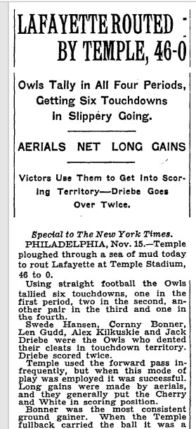 Temple took care of business 92 years ago against a Lafayette team that tied Penn State, beat Rutgers, and had a winning season. Not quite the same result two days ago but a win is a win.