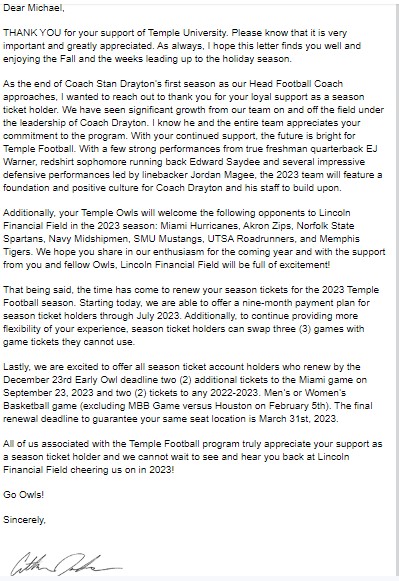 • Gotta wonder if this becomes a Catch-22 situation. Recruits come to see a cold late November game in an empty stadium and say “thanks, but no thanks” to Drayton. Under Rhule we had wins and the momentum of a pair of 10-win seasons at our backs and there was at least a good atmosphere in the stadium in November. Collins coasted to a $7.4 million job on the backs of those recruits, didn’t deliver Temple the promised talent and bolted for the money. Then Carey squeezed out the last remnants of Rhule recruits and took his $6 million buyout to the Midwest. Can’t win without recruits. Can’t get crowds without wins. Can’t get recruits without crowds. The cycle continues.