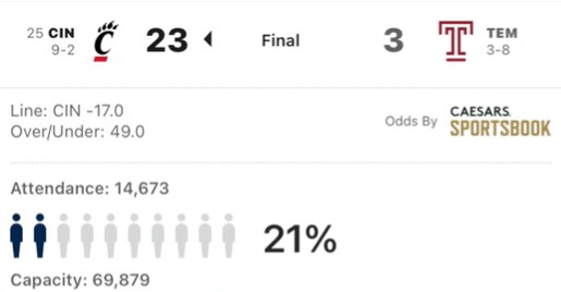 1. It’s deeply disappointing to realize how this program has tanked in such a short time since the glory days of 2015 (beat Penn State and nearly beat Notre Dame, both in front of packed stadiums with huge student presence- College Game Day) and 2016 and a conference championship. Terrible HC hire and COVID (which everyone had to deal with) are likely the main reasons. The only way to get butts back in the seats is to field a winning program and bring back the big boys like PSU and ND. But of course that should be obvious. Will it happen within many of our lifetimes? Who knows., but the outlook is not brilliant at the moment! The team started to show some improvement, but it will take time. A 21% full stadium is embarrassing. Yes it was bitter cold, but Rutgers had a sellout against Penn State on Saturday. An on-campus stadium would be nice, but not likely to happen any time soon. I have been a loyal alum for more years than I’d like to admit, but I can’t recall it ever being quite this bad. Major improvement needs to happen soon or the program may finally be terminated. It hurts me to say that, but it is what it is. Anyway- go Owls 🦉