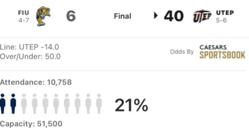 Both UTEP and Temple played home games at 21 percent capacity. Every other home game this past weekend had at least 30 percent capacity.