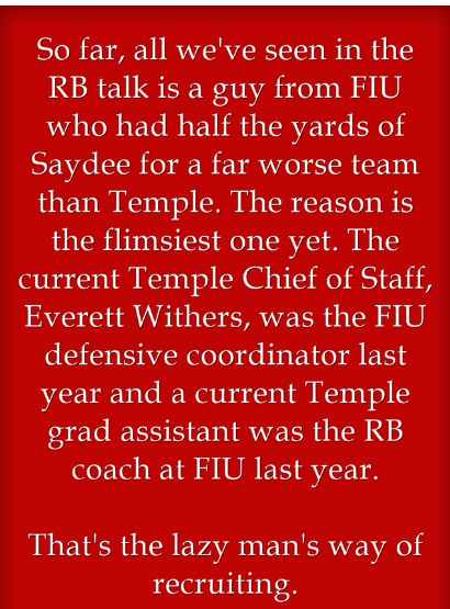So far, all we’ve seen in the RB talk is a guy from FIU who had half the yards of Saydee for a far worse team than Temple. The reason is the flimsiest one yet. The current Temple Chief of Staff, Everett Withers, was the FIU defensive coordinator last year and a current Temple grad assistant was the RB coach at FIU last year.