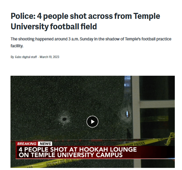 I was shocked when a place like Pub Webb was built. That was always a block or two farther West than I ever went on campus. 12th to 15th street was about as safe as any place in the city. Common sense. Thought Temple would expand its safety footprint when they built the E-O and, until last week, that spot was immune from the ills of the neighborhood. Had no idea the Hookah Lounge even existed. I did not notice it there last April.