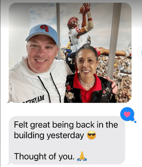 A former Temple head coach visited the E-O the other day and here he is with the great Nadia Harvin, in my humble opinion a true Temple treasure. Got to give the guy credit. He’s one of only three bowl-winning head coaches in Temple history (Wayne Hardin, Steve Addazio and him). Full disclosure: Geoff wasn’t thinking of me, he was thinking of official team photographer Zamani Feelings, who this photo is courtesy of … (Selfie by Geoff Collins himself)