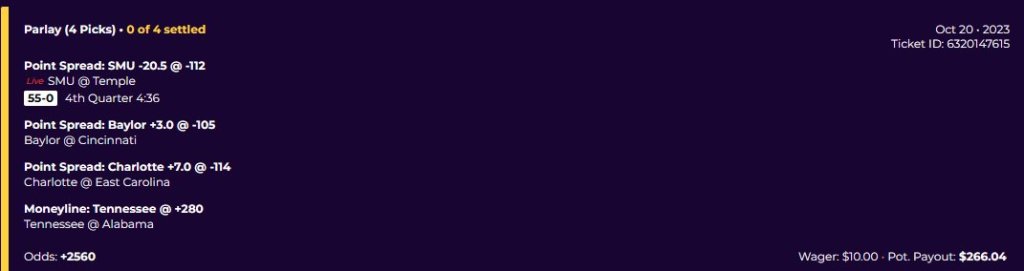Our picks this week. We’re a quarter on our way to a $266 payout for four measley games. Thanks, Stan and Everett. (Rather have Temple win and eat the money but this is getting too easy.)