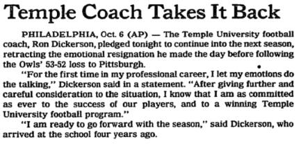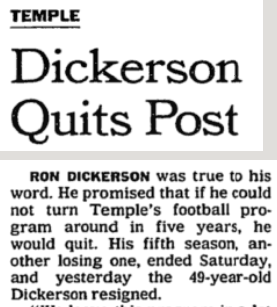 The 1994 season was one where Dickerson resigned on the spot following a 53-52 loss to Pitt, only to renege on the resignation a couple of days later. Temple had a 4th and 2 at midfield at Pitt Stadium only to go for it, give the Panthers a short field and see them score a last-second touchdown. Had the Owls merely punted there, Pitt would have had to go the length of the field with 52 seconds left no timeouts.