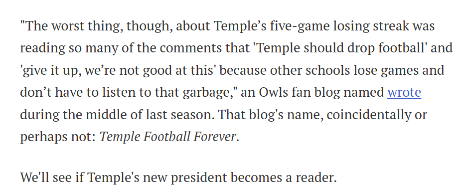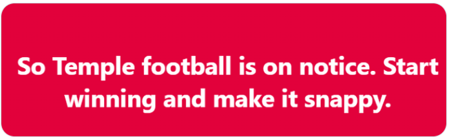 Talks cheap, so we’ll see what happens. But Temple has had many consecutive gosh-awful seasons in the past and still they carried on. Or maybe there’s enough donors and even BOT members who want to continue the program. Thing is its become so gosh-awful expensive now-a-days and Temple has other pressing issues to contend with. But for all of us who were thinking “its over” I for one was thinking not so fast folks – we’ll see. And hope it is just talk!