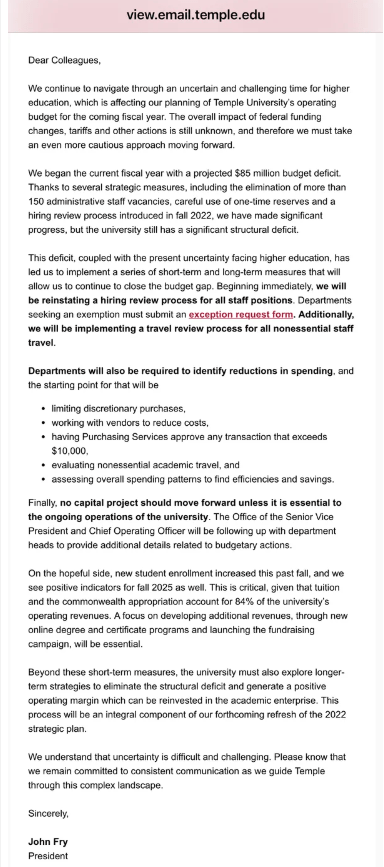 This week Temple president John Fry wrote a university-wide email (see above) about how Temple is strapped for cash and how the school is going to have to tighten that belt even more.