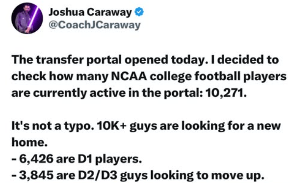 Although this number changes every day, there were only 1,452 FBS scholarships available as of 10 p.m. Thursday night. The math ain’t mathing for 90+ percent of these kids but don’t expect an “agent” to tell them that.