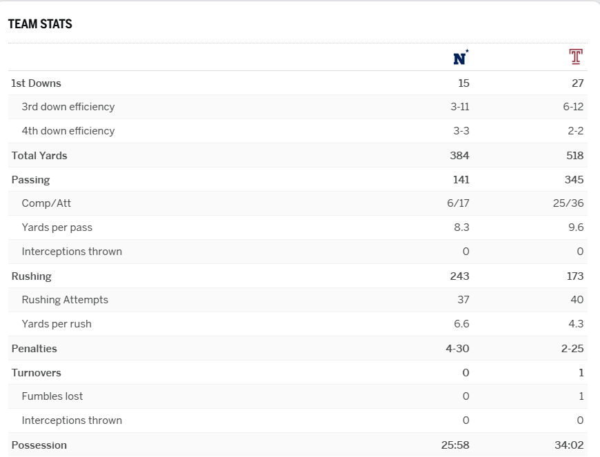 I knew the game was lost when we failed to make Navy burn those timeouts with a 1st and goal at the 1. That was the opportunity to win the game. Anything after that was waiting for the inevitable final gun. That timeout that Navy tricked Temple into taking on the 2-point conversion would have never happened. Horvath wouldn’t have taken a chance on a 51-yard run with no timeouts left. Just an incredible blown opportunity. This is why Brian Westbrook slid down at the 1 against the Cowboys one year instead of going in for the touchdown. Same principle.