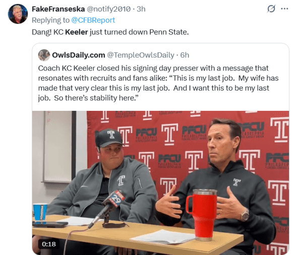 That might be the biggest football news of this offseason for K.C. Keeler and the Owls, whose wife has put her foot down. Both feet, really, firmly implanted in her hometown of Philadelphia, where the two met and married. She told Keeler that this is the last stop and he has agreed.