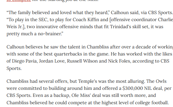 One team’s shit (Temple’s) is another team’s title (Ole Miss) but that doesn’t diminish the talent evaluation skills of Keeler or Barnes and that’s where Temple is at an advantage in this transfer portal season. Another thought is that Temple is so committed to winning in football that it put its money ($300,000) where its mouth was. Keeler knew that Evan Simon needed some competition and, while he whiffed on the first choice (Chambliss), he hit a solid double into the gap on his second (Gevani McCoy). If that’s not enough, here’s another Keeler/Barnes collaboration: They almost got Drew Mestemaker to commit to Sam Houston before Mestemaker decided to follow a high school teammate to North Texas.