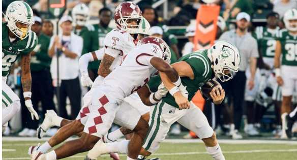 Grayson Mains (57) has been the bulwark for the Owls OL the past two seasons. RU’s John Stone wants that job. That should be a key position battle.