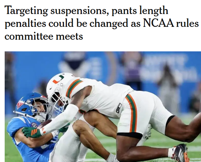 One, the targeting rule where a player from the second half of one game is penalized by sitting out the first half of the next game. That rule never made much sense since the next game could come after a bye week or even a month of bowl preparation. That begs another question, though: Is targeting only going to be enforced in the first half? That’s something the committee will have to deal with.