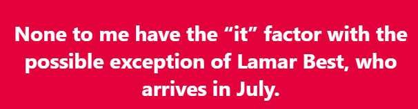 • Don’t see them beating either team without a proven QB. The X factor is Lamar Best. He could be HIM. If he’s “just” a freshman version of P.J. Walker, it’s not good enough. I know if Best comes in and balls out in August, he’s way better than Smolik and Sheppard and they won’t be able to keep him off the field.