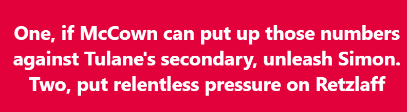 One, if McCown can put up those numbers against Tulane’s secondary, unleash Simon. Two, put relentless pressure on Retzlaff.