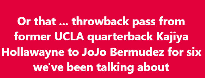 Or that long-awaited throwback pass from former UCLA quarterback Kajiya Hollawayne to JoJo Bermudez for six we’ve been talking about for nine weeks.