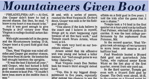 Newspaper clipping chronicling Jim Cooper’s heroics in Temple’s win over West Virginia.