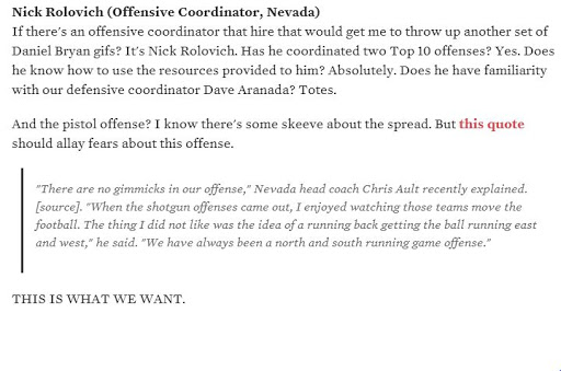 The other half of the battle is assembling a good staff. Without mentioning names, there is some discussion of bringing in a guy from Kansas and Colorado who allowed more than 30 ppgs in high-profile DC jobs.