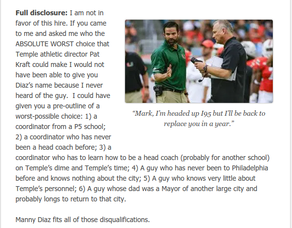 Unfortunately, I was proven correct–as I was years later in my assessment of both the Manny Diaz and Stan Drayton hirings.