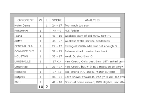 To me, seven wins against this schedule (Idaho, Fordham, Memphis and Army as the givens and three of the other eight) is realistic and attainable. (Army has had a more recent history of success than Memphis has had and Temple has handled the Cadets pretty easily.)
