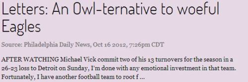 That’s one of the possible fixes. The other fix would be to move Kevin Newsome from offense to the middle of the field on defense. Daz says he’s not playing more at quarterback because he doesn’t know all the plays. (I don’t know how that’s possible since all they do is run it up the middle, do a read option left and a read option right and throw an occasional pass. That’s four plays to remember.) Then put him in the middle of the field on defense and tell him to knock down or intercept any ball in his zone. Since Temple has been killed on passing plays over the middle, Newsome could not be any worse than what the Owls have now. He is perhaps their most freakishly good athlete.
