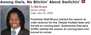 KEE-AYRE GRIFFIN _ Went from running back in the 2008 season to cornerback. In the 2011 game against Penn State, KAG made a spectacular interception of Matt McGloin that nearly sealed the win for the Owls. Griffin was mostly a lock-down corner the rest of his career at Temple and had a pick to the house that kick-started a rout of Kent State. Fumbled in a 2008 overtime loss at Navy and   coach Al Golden had to rescue KAG from under the  bus to make the move to DB. (I still think AG should have punted and made Navy go 80 yards in 17 seconds with no time outs left.)