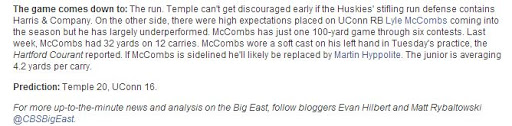 Temple has the edge at QB, RB, special teams and coaching. UConn has an aging coach and offensive coordinator, Paul Pasqualoni and George DeLeone, that the fan base is generally dissatisfied with while Temple has three key members of two SEC national championship teams (Addazio, DC Chuck Heater and OL coach Justin Frye) running the show.