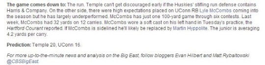 Yeah, we know that the NYDN picks by the 5 1/2-point spread but the consensus is so overwhelming that it’s probably a safe bet that 1-4 of the panelists think Temple is going to win that game outright. For the record, The Philadelphia Inquirer’s Keith Pompey picked Temple to win, as did CBS Sports. Two ESPN bloggers picked UConn to win.