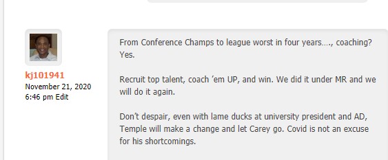 In the year of Covid, probably two or three years of it, really, no one is getting fired at any university because the revenue streams coming in are so unpredictable. The Owls are allowed almost no fans this year and next year is up in the air as well.