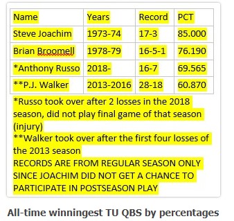 All that aside, though, all Russo will have to do the next two seasons is do what he did in the 2019 regular season in touchdown passes (21) and yards (2,861) and he will have two significant career quarterback records at a school that began playing football two centuries ago.
