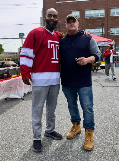 Former Temple running back Marc Baxter (here with former TU LB Bobby Harrington), wins the best Temple swag award at this year’s tailgate. I asked Marc where he got the shirt and he said at the Temple bookstore and that it was a Temple ice hockey shirt. (Photos courtesy of Bobby Harrington)